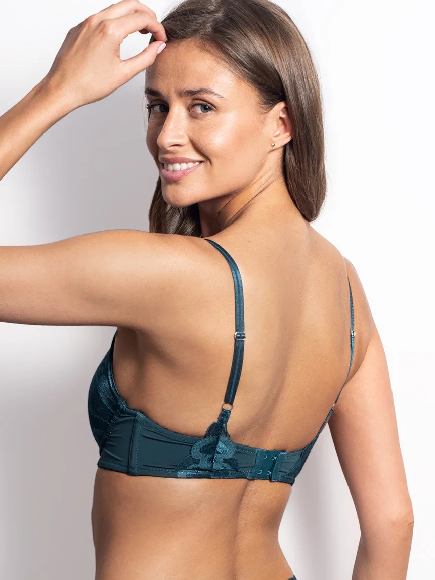 Push-up bra with a cup covered with lace and a thermally embedded satin push-up insert. Light construction with a delicate, unfilled insert allows for free air flow. The Soft Touch Up push up bra has an additional advantage of a perforated inner side of the cup. This solution ensures a feeling of freshness and comfort. The bra closes the breast well from the armpit. Soft touch up has a deeper and more spacious cup, less built-up at the top. The shape of the cup perfectly exposes the bust, supporting it from underneath.