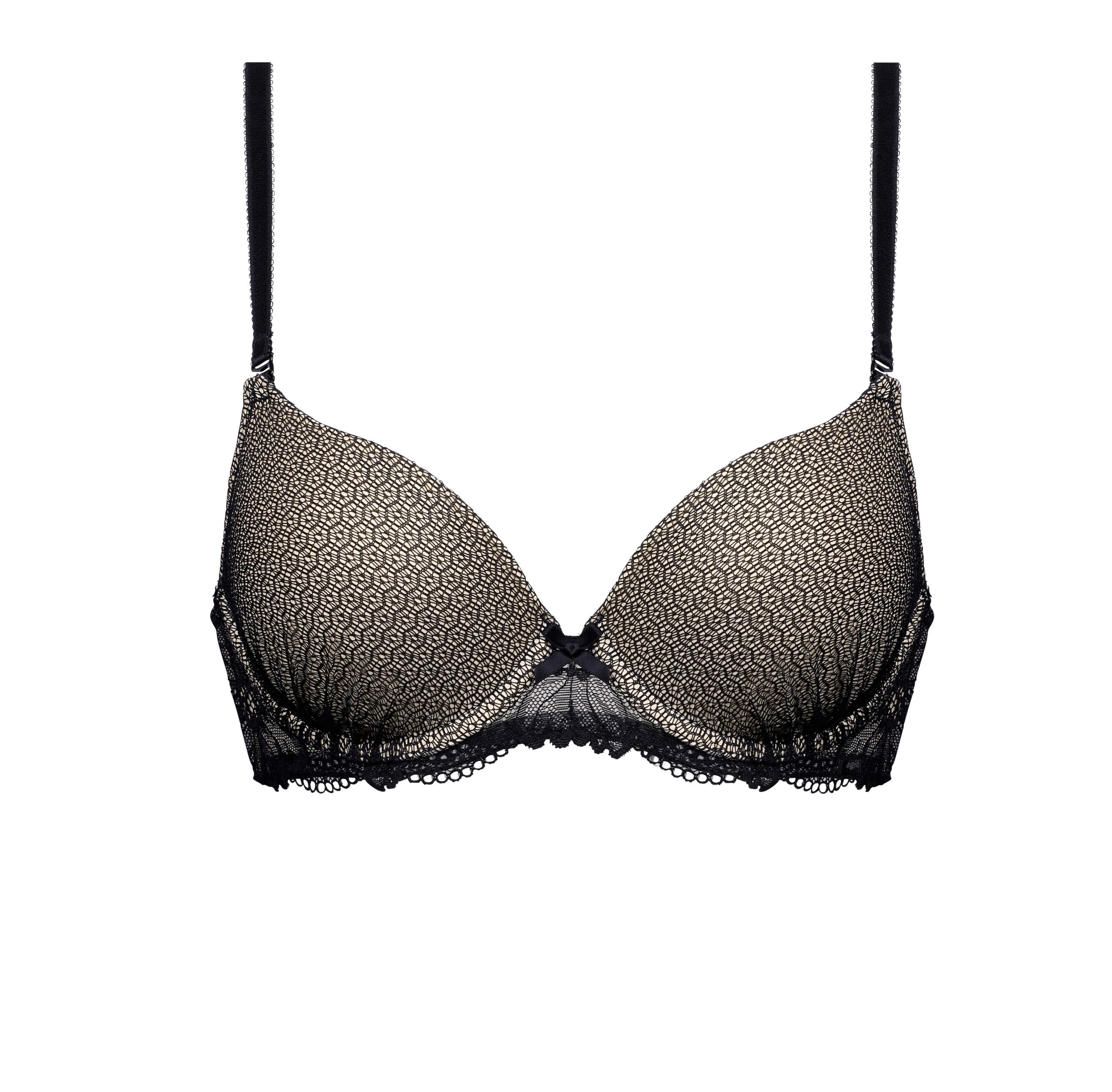 Biustonosz Push Up My Body koronkowy z termicznie wtopioną wkładką push up wypełnioną żelem o mniejszej płynności dzięki czemu biustonosz może utrzymać ładniejszy kształt. Biustonosz jest naturalny w dotyku, bardzo komfortowy. Kształt miseczki biustonosza My Body Push Up jest idealny do głębokich dekoltów – efekt uniesienia piersi „jabłuszka”. Biustonosz push up dobrze zamyka pierś od strony pachy, głębsza i pojemniejsza miseczka, nieco zabudowana od góry.