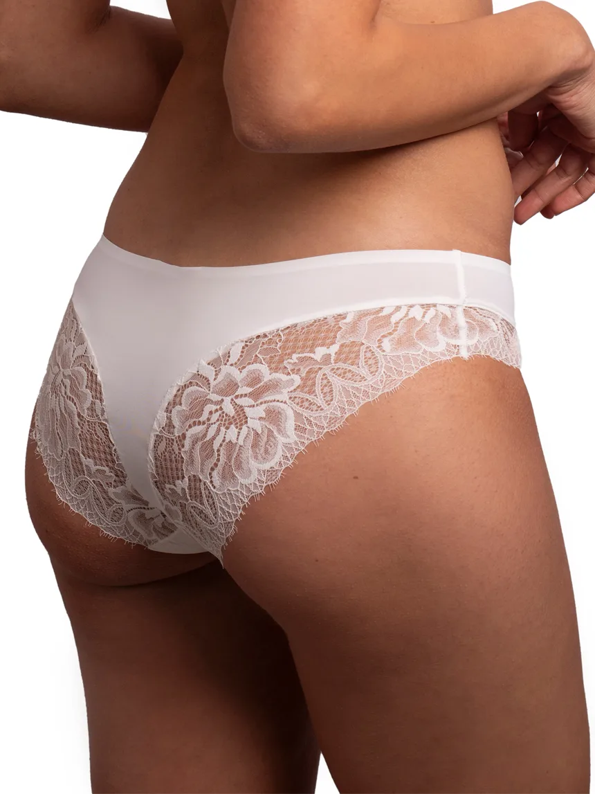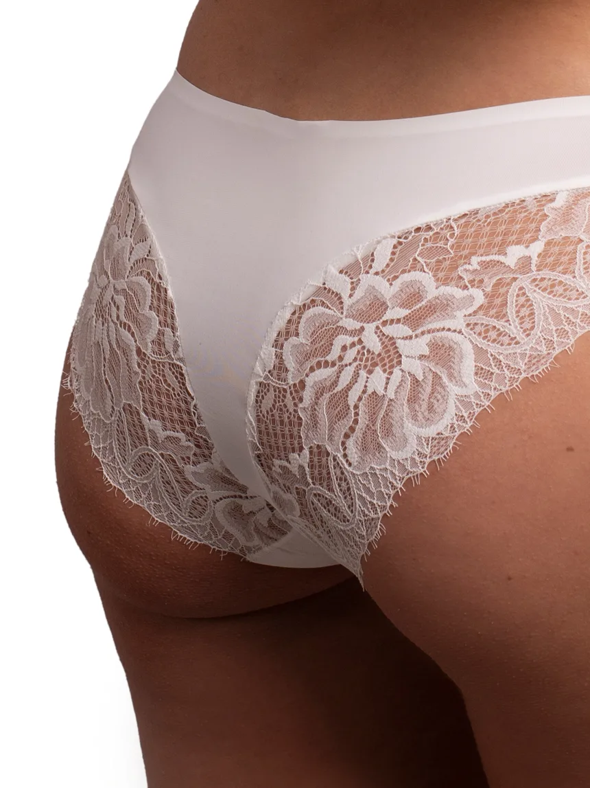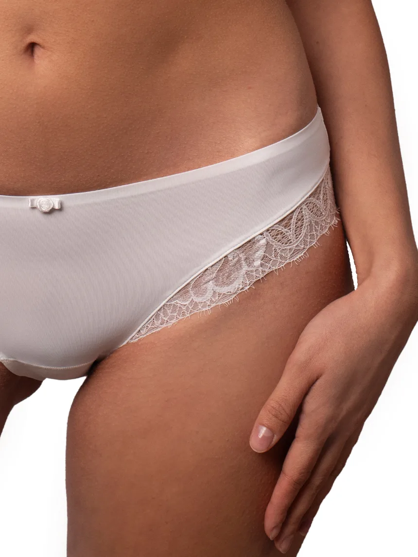 Microfiber and lace bikini briefs. The lack of seams means that both the waist and the crotch of the bikini remain flat and comfortable. A discreetly covered microfiber front and a slightly bolder back with lace inserts on the edges. Smooth microfiber panties fit the body very well, are gentle on the skin and remain invisible under clothes.