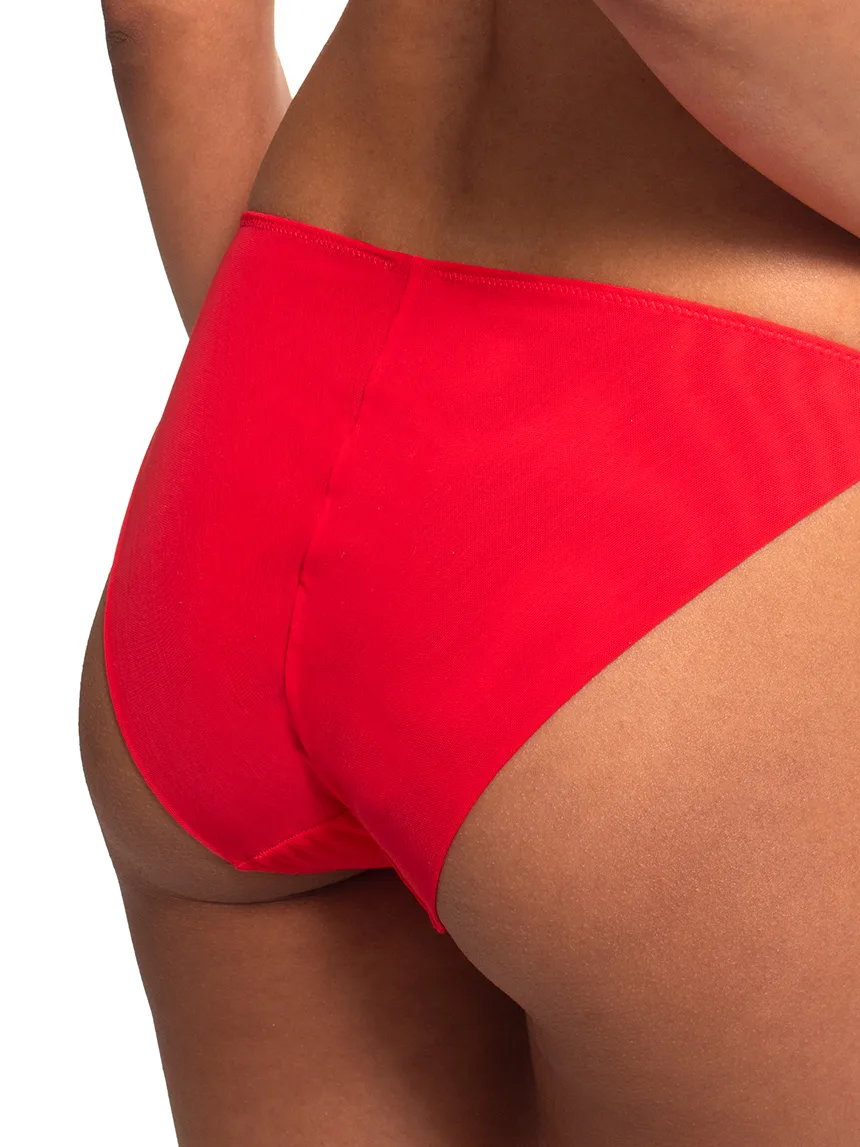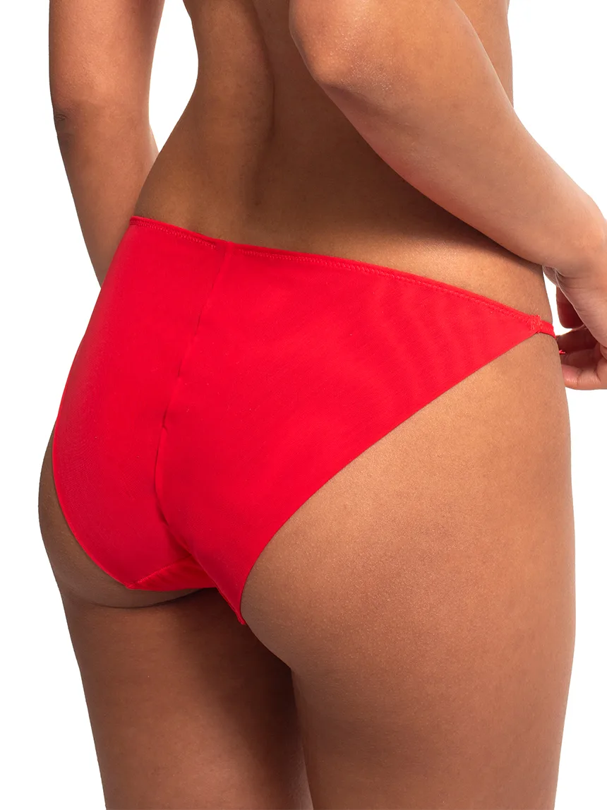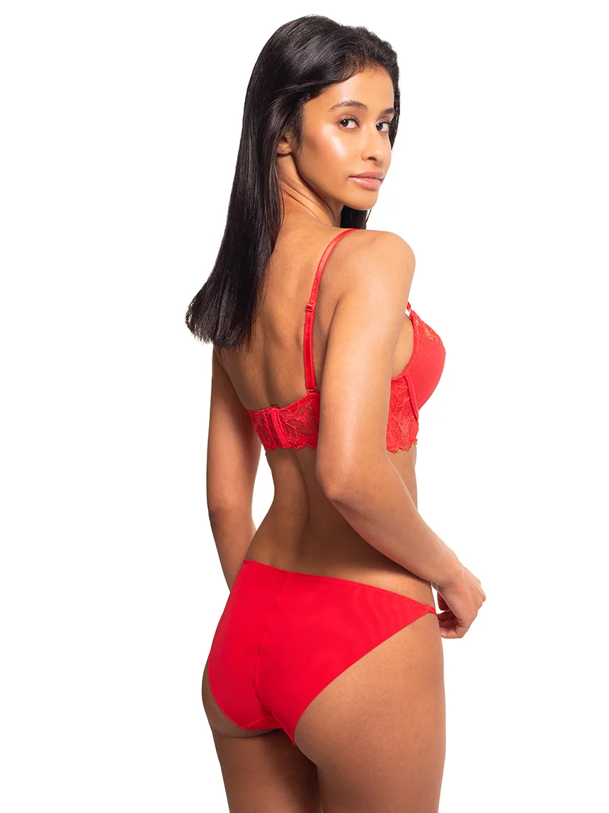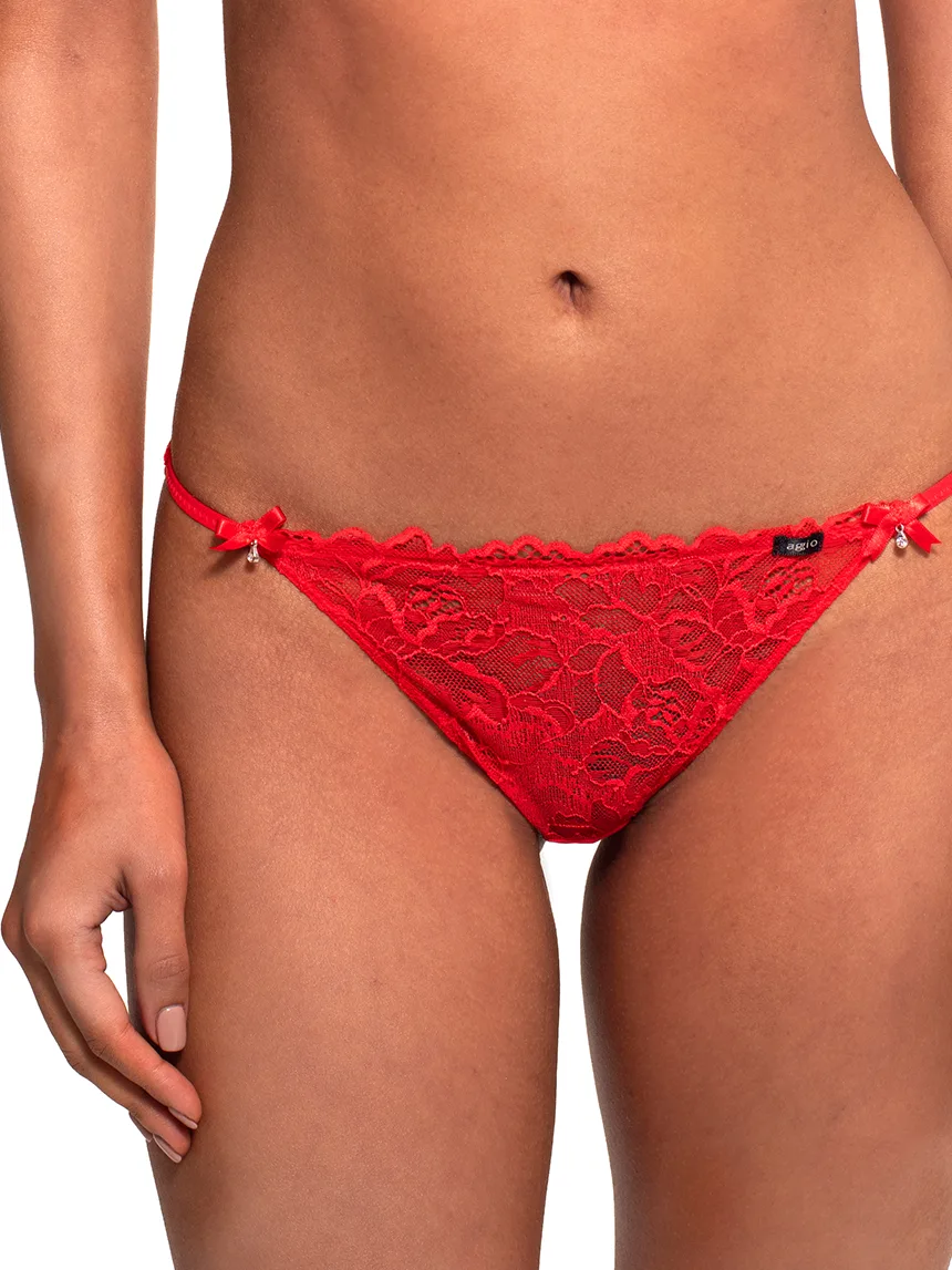 Tanga briefs made of lace and soft microfiber. Completed with two elegant details in the form of a bow with a shiny decoration.