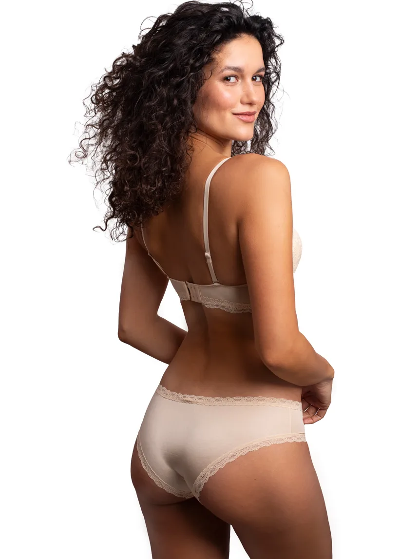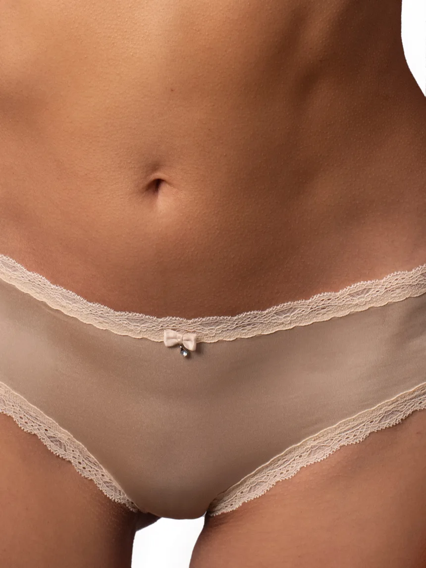 Smooth bikini panties made of soft and shiny microfiber that fits perfectly to the body and remains invisible under clothes. The edges of the figs are finished with delicate and elegant lace. Smooth bikini panties are additionally decorated with a bow with a shiny decoration.