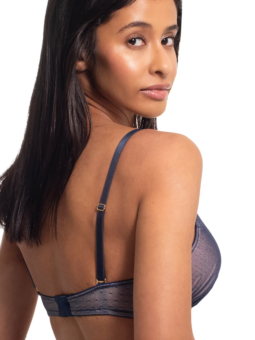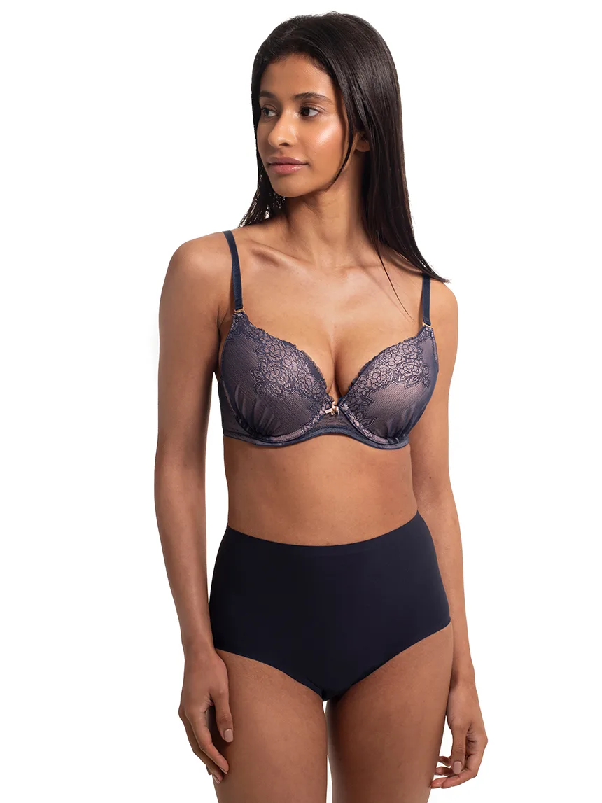 Biustonosz push up z gładką koronką posiada miseczkę z termicznie wtopioną wkładką wypełnioną nowym rodzajem żelu o mniejszej płynności, dzięki czemu biustonosz może utrzymać ładniejszy kształt. Biustonosz push up my body pod wpływem ciepła ciała idealnie dopasowuje swój kształt do biustu. Gwarantuje naturalny efekt uniesienia piersi a delikatny materiał miseczki daje poczucie drugiej skóry. Głębsza, pojemniejsza i nieco zabudowana do góry miseczka dobrze zamyka pierś od strony pachy.