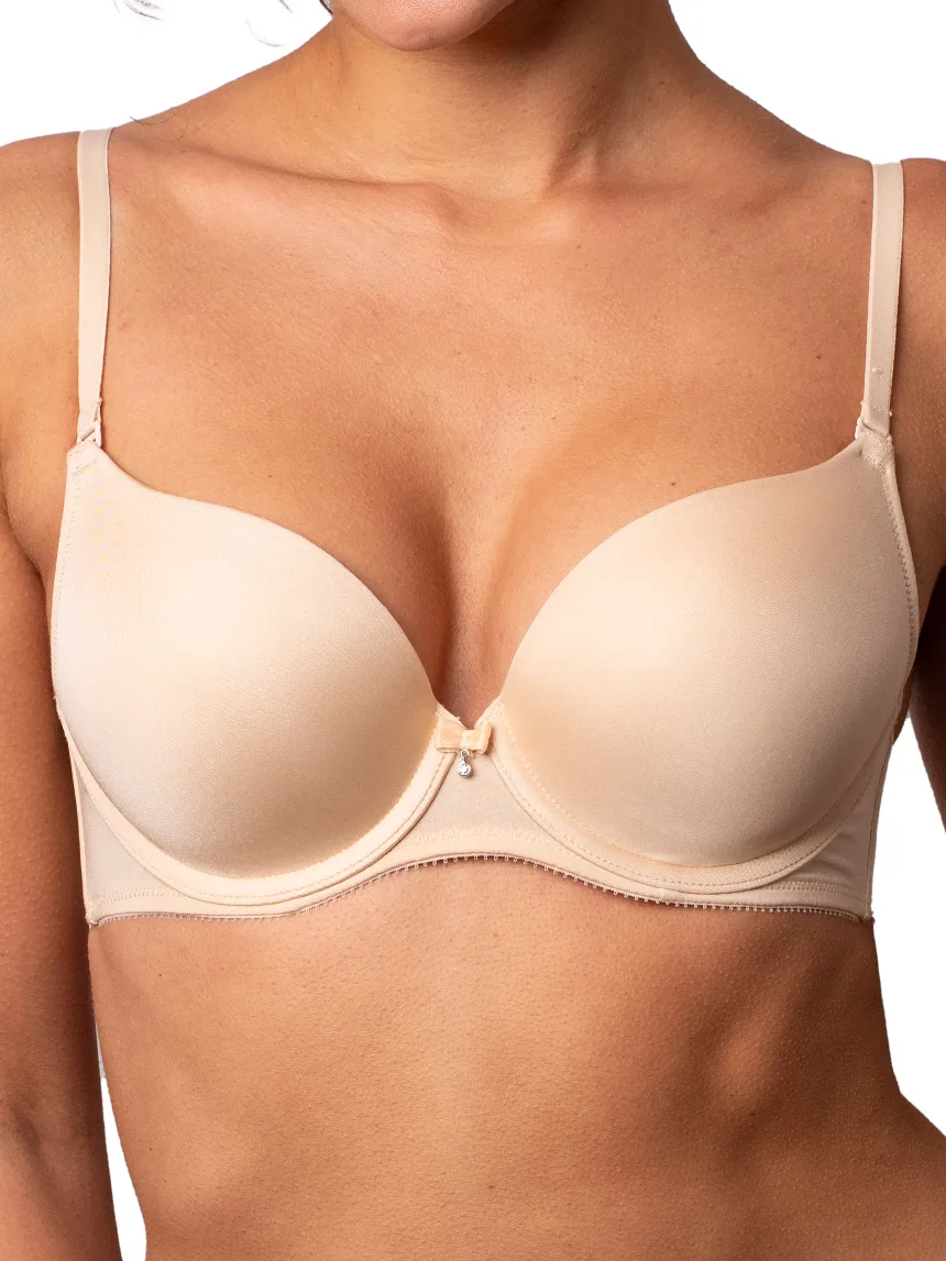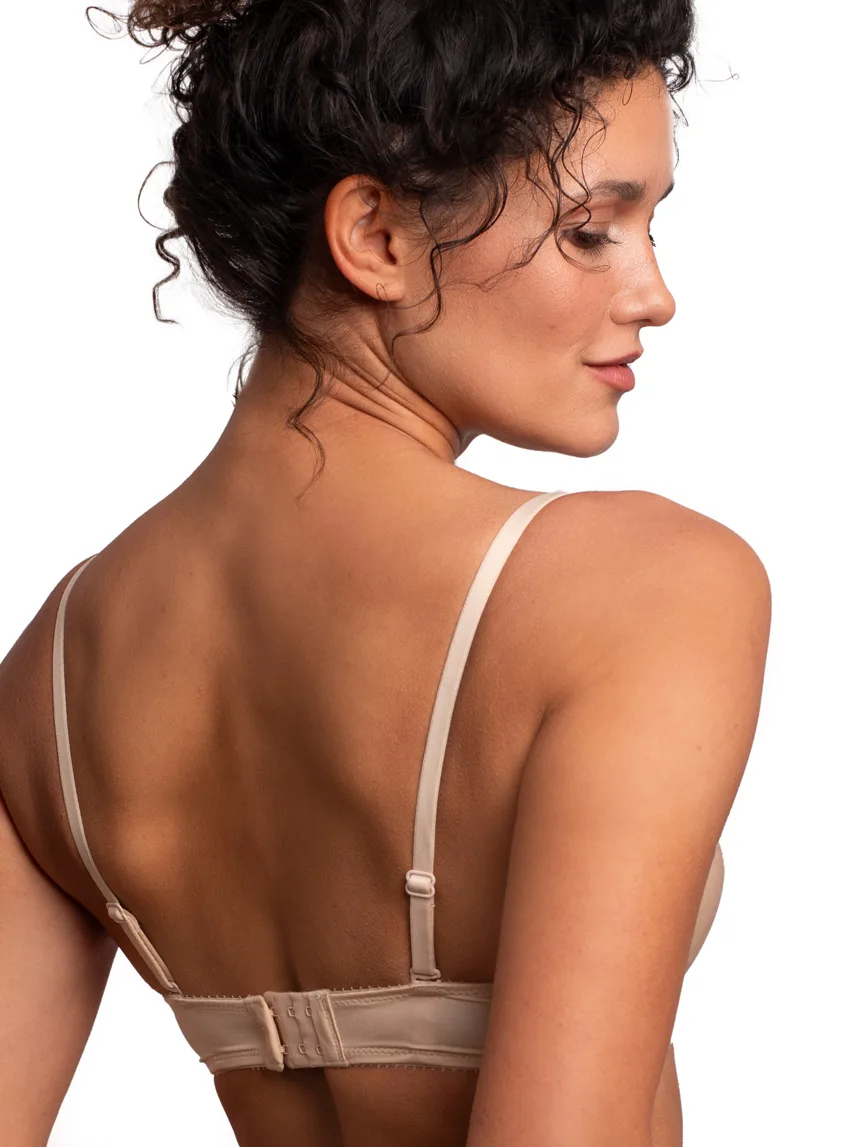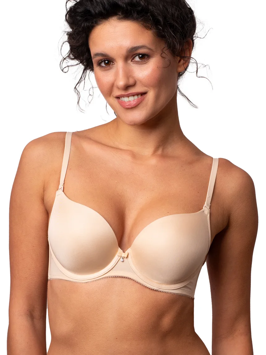 Biustonosz gładki push up My Body pod wpływem ciepła kobiecego ciała dopasowuje się do kształtu biustu. Miseczka pokryta gładką i połyskującą mikrofibrą posiada termicznie wtopioną, delikatną i lekką wkładkę push up wypełnioną żelem, który reaguje na temperaturę biustu. Biustonosz gładki push up gwarantuje naturalny efekt uniesienia i powiększenia biustu, idealnie zbiera piersi do środka. Głębsza, pojemniejsza i nieco zabudowana od góry miseczka, dobrze zamyka pierś od strony pachy. Biustonosz push up My Body My Bra w dotyku jest jak druga skóra, delikatny, lekki i bardzo komfortowy.