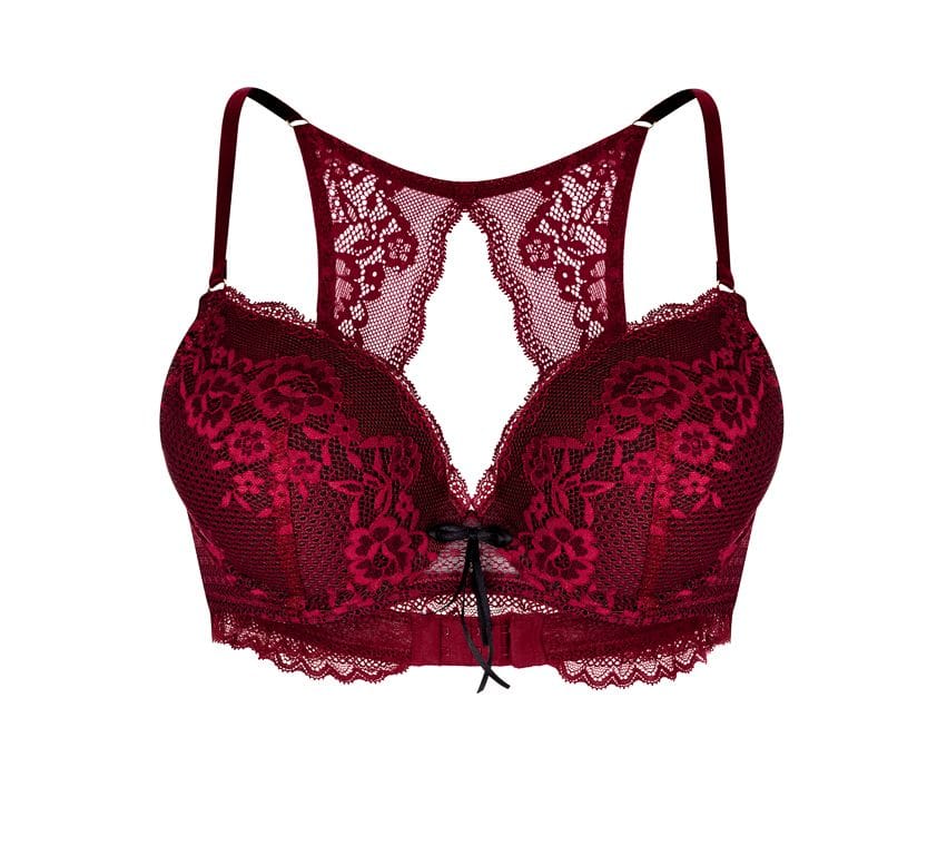 Biustonosz z koronkowym tyłem My Body Push Up bordo z termicznie wtopioną wkładką push up wypełnioną żelem o mniejszej płynności dzięki czemu biustonosz może utrzymać ładniejszy kształt. Biustonosz jest naturalny w dotyku, bardzo komfortowy. Kształt miseczki biustonosza My Body Push Up jest idealny do głębokich dekoltów – efekt uniesienia piersi „jabłuszka”. Biustonosz push up dobrze zamyka pierś od strony pachy, głębsza i pojemniejsza miseczka, nieco zabudowana od góry.