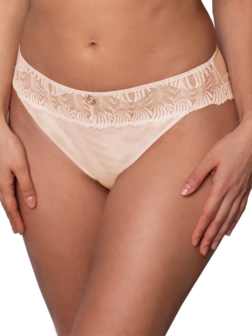 Majtki bikini z koronkowym pasem z oryginalną krawędzią. Na froncie ozdoba w postaci złotego wisiorka. Tył wykończony koronką i siateczkową wstawką.